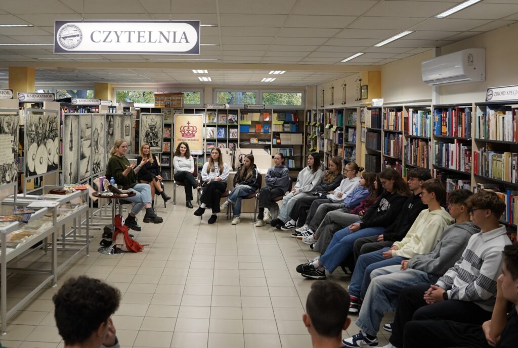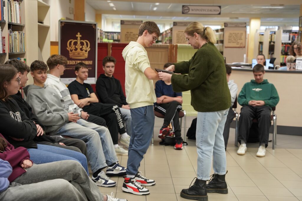 W piątek 24.10.2025 klasa 2A miała okazję uczestniczyć w inspirujących warsztatach edukacyjnych „1000 lat Korony Polskiej” zorganizowanych przez Miejską Bibliotekę Publiczną w Dąbrowie Tarnowskiej. Zostały one przeprowadzone w ramach programu „Dziedzictwo Korony – opowieść łącząca pokolenia”. Spotkanie z ogromnym zaangażowaniem i pasją prowadziła dr Agnieszka Jankowiak-Maik znana jako „Babka od histy”. Jest ona historykiem, nauczycielką z dużym doświadczeniem w edukacji zarówno młodzieży jak i dzieci, autorką książek „Historia, której nie było”, „W czym Chrobry był dobry? Niezła historia!”, „Skąd się wzięła Polska?”. Uczniowie podczas warsztatów przenieśli się w czasy plemion słowiańskich oraz Bolesława Chrobrego, mogli poczuć klimat epoki nie tylko dzięki barwnej opowieści „Babki od histy” ale także poprzez repliki przedmiotów pochodzących z czasów pierwszych Piastów. Klasa 2A aktywnie włączyła się w warsztaty zadając liczne pytania oraz dyskutując nad kontrowersjami związanymi z najdawniejszymi dziejami Polski. Taka atrakcyjna forma poznawania historii na długo zostaje w pamięci a także zachęca do samodzielnego pogłębiania wiedzy.