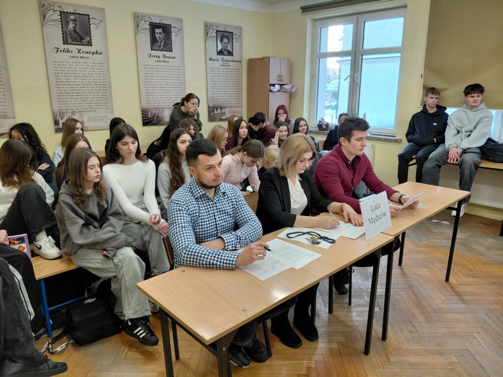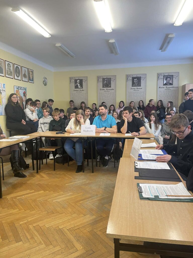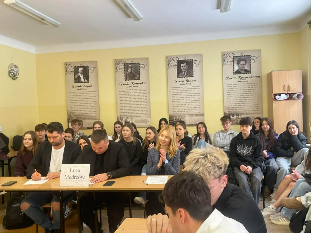 Kolejnego pojedynku wysłuchaliśmy w ramach debaty nad tezą: „obowiązkowa służba wojskowa zwiększa bezpieczeństwo państwa.” Klasa 3F (propozycja) zmierzyła się z 3C (opozycja), prezentując argumenty odwołujące się do bezpieczeństwa, odpowiedzialności obywatelskiej oraz współczesnych realiów geopolitycznych. Zwycięstwo odniosła klasa 3F. W loży mędrców zasiedli: p. Curyło, p. Lubera oraz p. Duda.