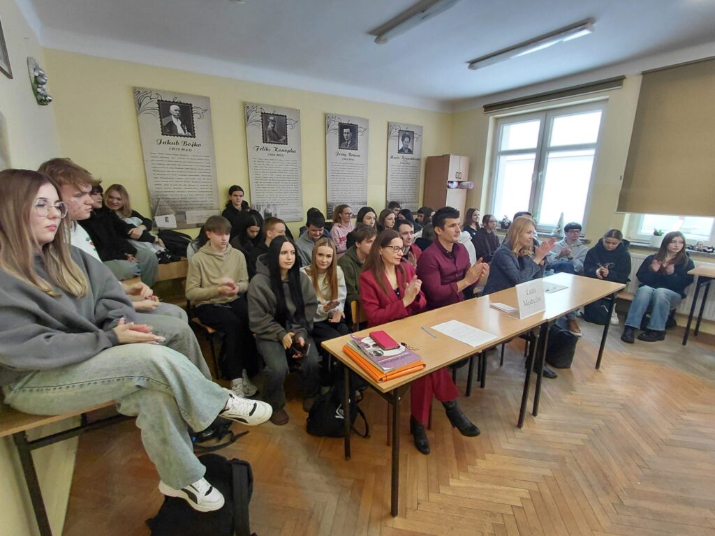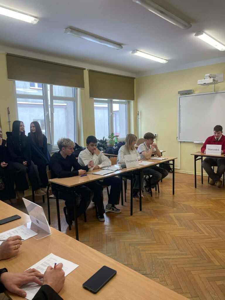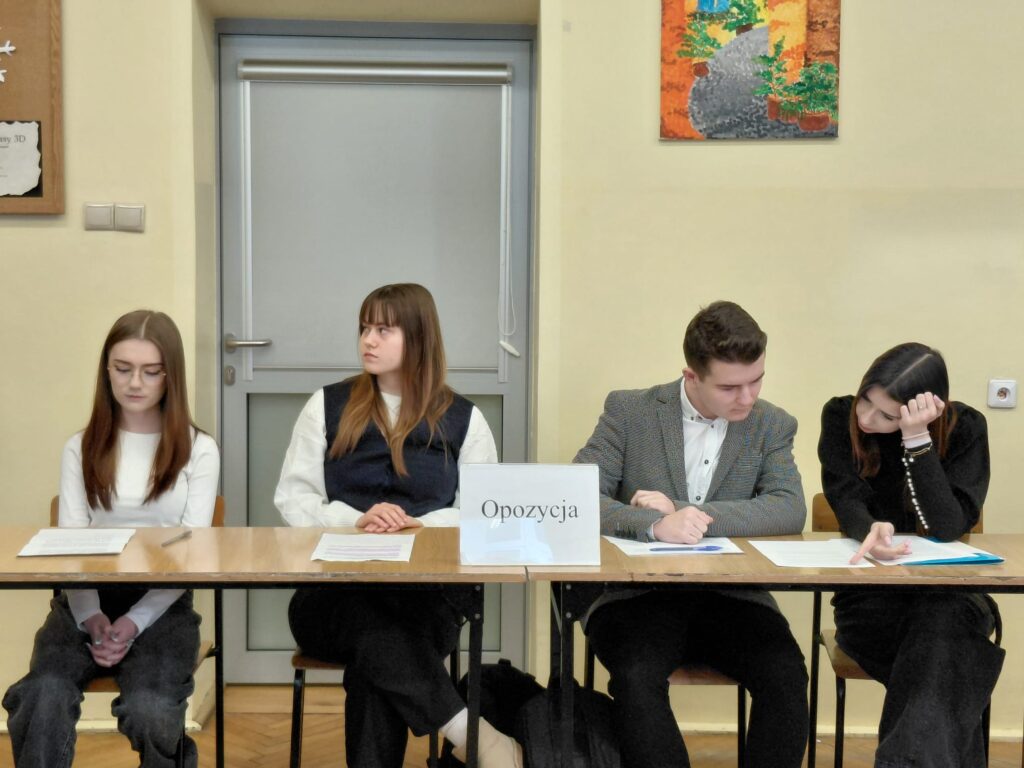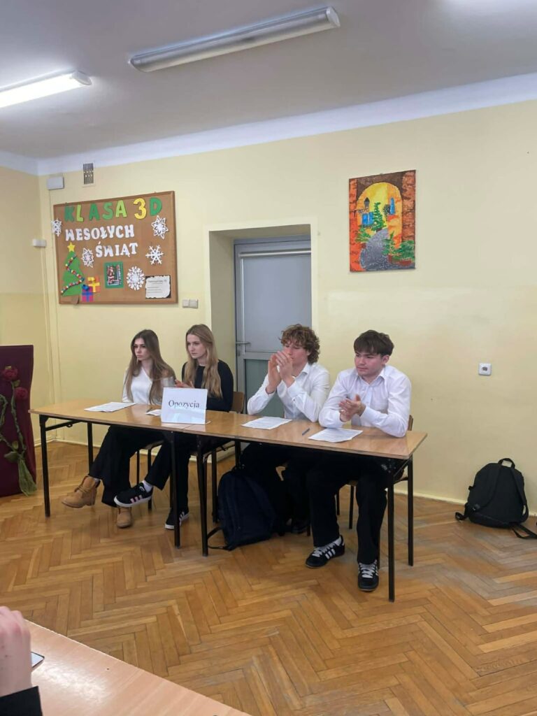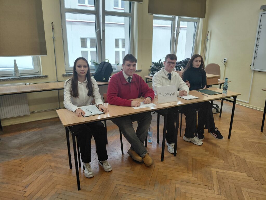 Pierwsza debata 9 stycznia 2026 r. dotyczyła tezy: „szkoły powinny przejść na czterodniowy tydzień nauki.” Drużyna propozycji z klasy 1B zmierzyła się z opozycją z 3E, prowadząc żywą i wyrównaną dyskusję dotyczącą dobrostanu uczniów, efektywności nauczania oraz organizacji pracy szkoły. Zwyciężyła klasa 1B. Debatę oceniali: p. Zych, p. Soja oraz p. Nowak.