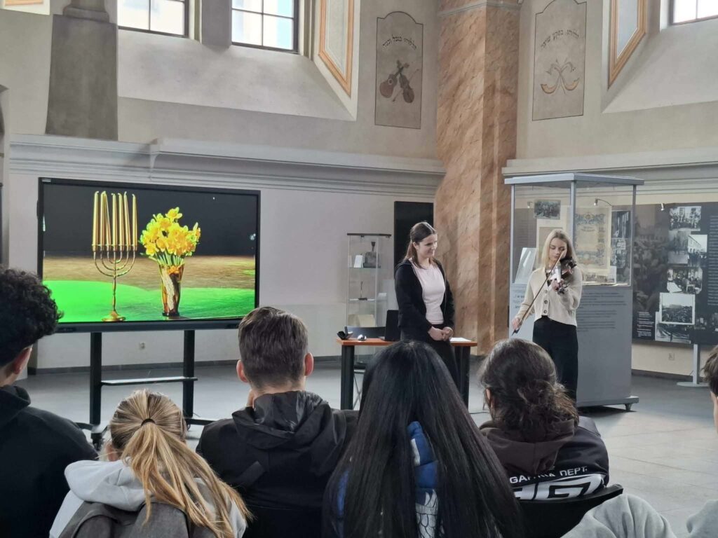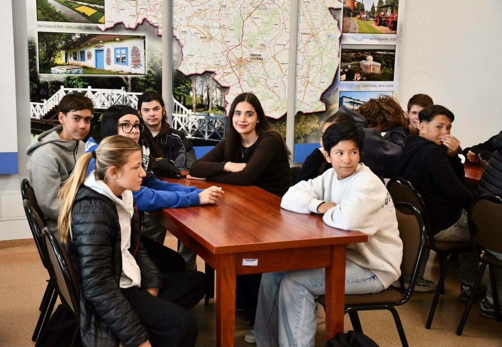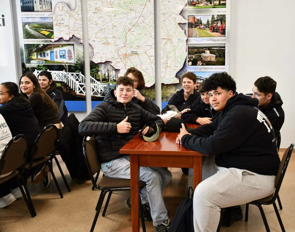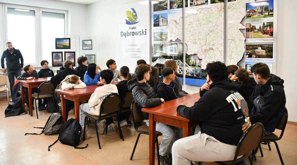 21 kwietnia 2026 r. grupa francuska wraz z nauczycielami-opiekunami oraz polska młodzież z I LO im. T. Kościuszki w Dąbrowie Tarnowskiej złożyła wizytę władzom Powiatu Dąbrowskiego i została serdecznie powitana przez Wicestarostę, Pana Krzysztofa Bryka w siedzibie Starostwa Powiatowego. Uczniowie z obu krajów uczestniczą w licznych warsztatach, spotkaniach i zajęciach edukacyjnych, których celem jest pogłębienie wiedzy na temat tragicznych wydarzeń II wojny światowej oraz rozwijanie postaw szacunku, tolerancji i dialogu międzykulturowego. Ważnym elementem programu jest zwiedzanie miejsc pamięci związanych z historią lokalnej społeczności żydowskiej. Młodzież pracuje w międzynarodowych zespołach, analizując lokalne źródła historyczne, relacje świadków oraz kontekst europejski. Edukacja historyczna, poprzez m. in. aktywną formę pracy terenowej, stanowi żywą lekcję pamięci i empatii, będąc jednocześnie mostem łączącym młode pokolenia Europy. Uczestnicy projektu mają okazję lepiej się poznać, wymienić doświadczeniami oraz odkrywać różnice i podobieństwa kulturowe. Wspólne działania sprzyjają budowaniu relacji i wzajemnemu zrozumieniu.