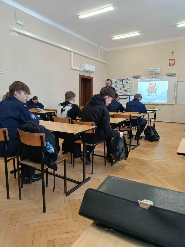 W dniu 16.02.26r. 1 klasa o profilu mundurowym oraz 1 klasa oddziały przygotowania wojskowego uczestniczyli w zajęciach na temat: „Poszanowania munduru” oraz zadań Policji. Zajęcia