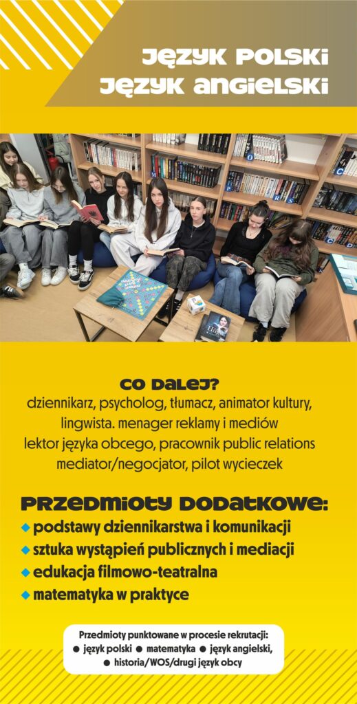 Rozszerzony program nauczania języka angielskiego i języka polskiego pozwala na łączenie zainteresowań humanistycznych, literackich i językowych z pasją poszukiwania, odkrywania i interpretowania ciekawych zjawisk społecznych oraz wydarzeń kultury. Na podstawie zdobytej wiedzy uczniowie rozwiną swoje umiejętności w komunikacji interpersonalnej. Nauczą się rozpoznawać i interpretować mechanizmy funkcjonowania kultury masowej i popularnej, a także kultury wysokiej. Dzięki dodatkowym zajęciom uczniowie osiągną biegłość w posługiwaniu się językiem obcym. Rozwiną również swoje umiejętności literackie, oratorskie i interpersonalne. Będą mieć okazję zaprezentować swoje zdolności i umiejętności, występując w przedstawieniach przygotowywanych w ramach koła teatralnego czy tworząc artykuły zamieszczane na stronie internetowej szkoły.